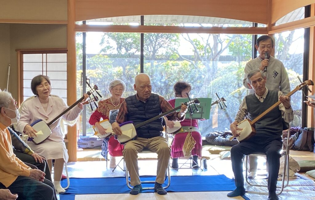 お茶をいただいた後は、三味線教室の生徒さんによる演奏が行われました。 新春にふさわしい華やかな音色が和室いっぱいに響き渡り、会に一層の彩りを添えてくださいました。力強く、かつ繊細な三味線の響きに、出席者一同、静かに耳を傾け、心豊かな時間を共有することができました。